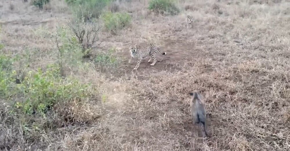 В Кении туристы запечатлели необычную сцену из мира животных. Смелый бородавочник разогнал трёх гепардов, пытавшихся его окружить.