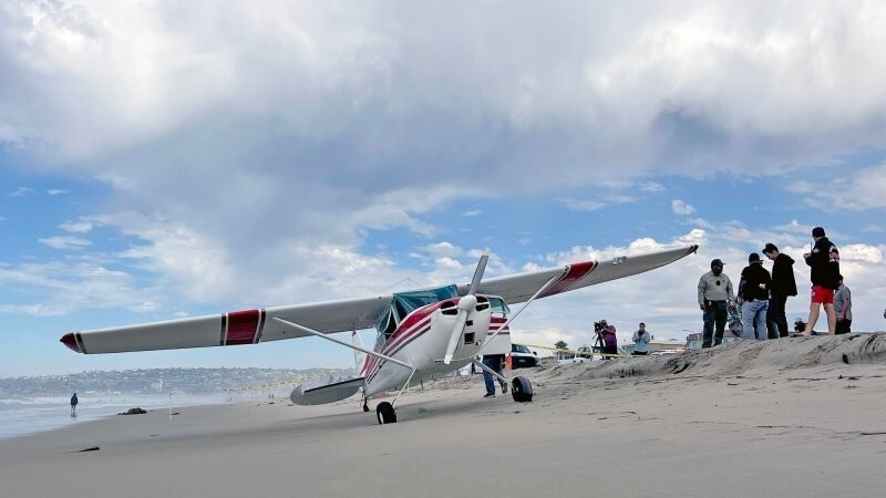 Небольшой самолёт «Сессна» совершил аварийную посадку на пляже Мишн-Бич после отказа двигателя. Пилот с дочерью на борту сумел посадить машину прямо на песок, никого не задев. Очевидцы называют место приземления «идеальным».