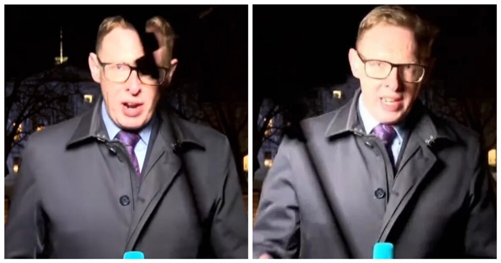 Репортер ирландского канала RTE News Мишель Лехан заметил, как один из осветительных приборов начал падать. Мужчина с невозмутимым видом поймал осветительное оборудование.