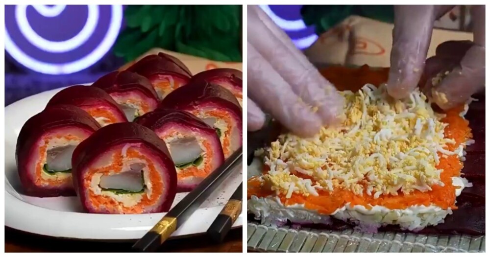 Мужчина показал, как приготовить роллы «Селёдка под шубой». Понадобятся: селёдка, свёкла, картофель и другие ингредиенты популярного новогоднего салата.