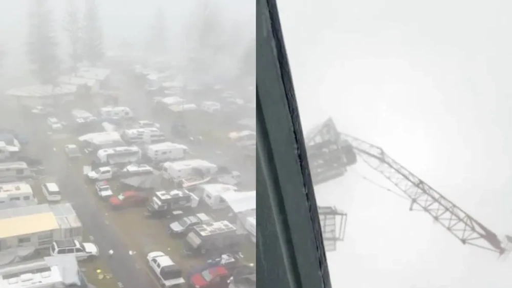 Во время мощного рождественского шторма в Австралии огромный строительный кран сломался пополам. В результате многотонная металлическая конструкция зависла под углом и вот уже несколько дней угрожающе нависает над туристическим парком Бродвотер.