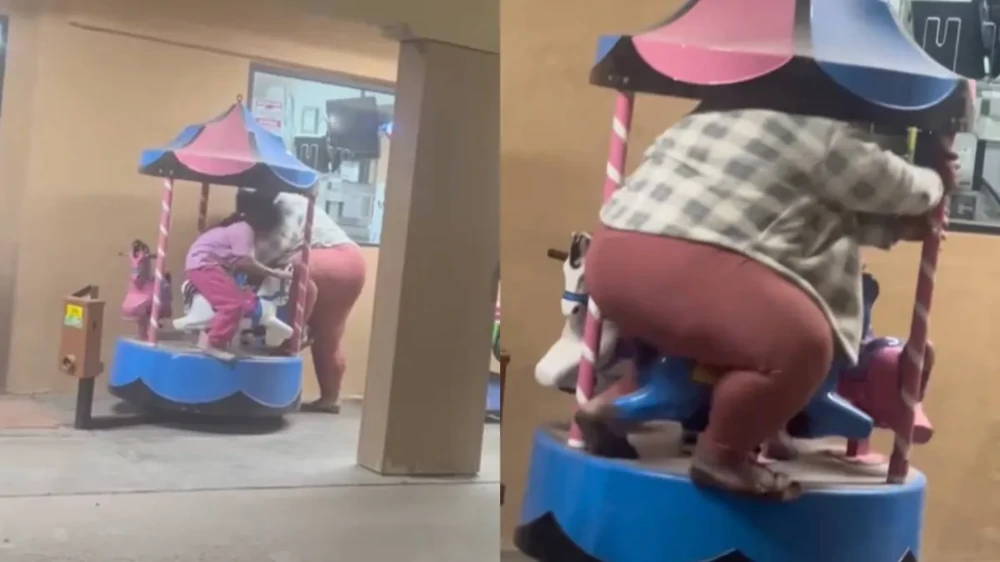 Мама решила прокатиться вместе с ребёнком, но мини-карусель оказалась слишком маленькой для её внушительных форм. Аттракцион явно не ожидал такой нагрузки — и поездка получилась максимально неловкой.
