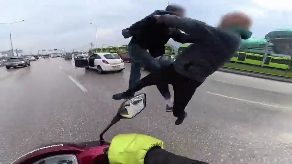 На быстро движущейся дороге в Турции водитель мотоцикла заметил, как автомобиль внезапно остановился прямо на трассе. Из машины вышли мужчина и женщина и в ходе конфликта начали драться посреди проезжей части, толкаясь и боксируя, словно на тренировке боевых искусств.
