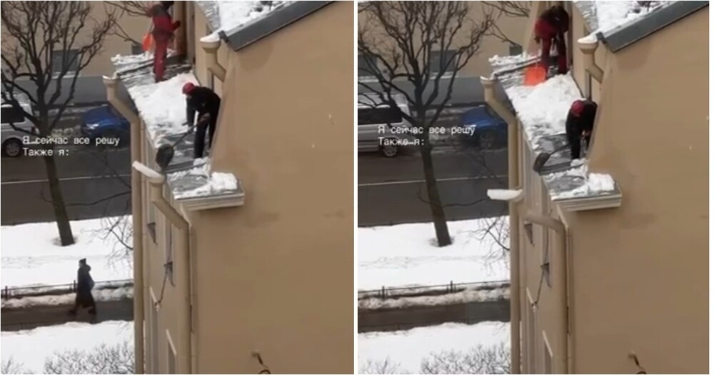 В Петербурге на голову прохожих с крыши падает не только снег, но и строительные элементы. Один усердный коммунальщик во время очистки льда оторвал кусок трубы.