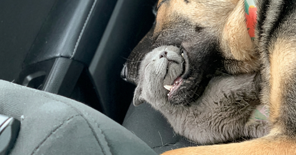 Ничего необычного, просто кошка спит в машине, засунув голову в пасть собаки.
