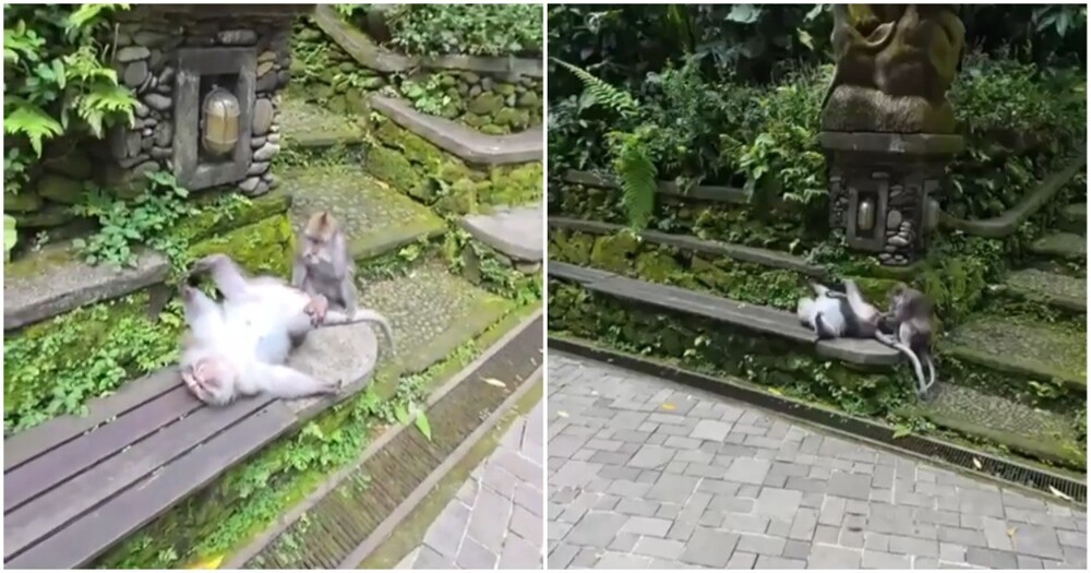 Турист заснял обезьян за странным занятием. Один из приматов выдирал у другого шерсть из области живота и ниже.