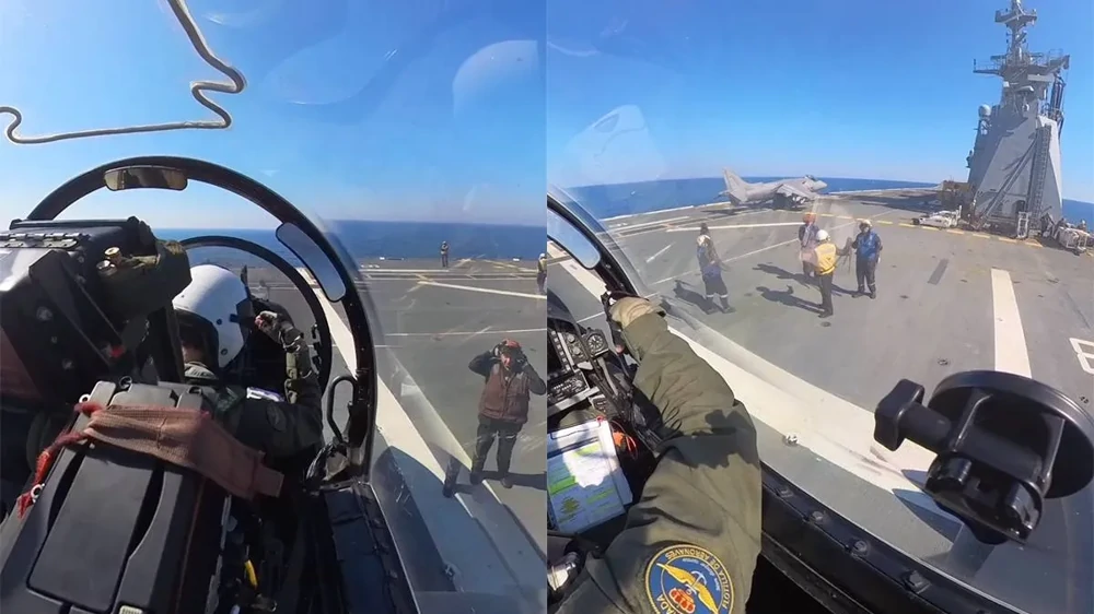 Впечатляющее видео, снятое от первого лица, на котором запечатлён момент запуска британского реактивного истребителя Harrier Jump Jet с борта авианосца. Самолёт, способный к вертикальному взлёту и посадке благодаря особой системе двигателей, демонстрирует уникальные самолётные возможности прямо с палубы военного корабля.