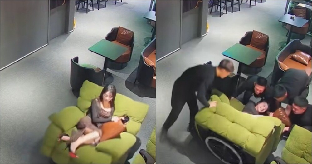 В одном из кафе появилось видео, на котором девушка садится на кресло, и оно неожиданно опрокидывается назад. На помощь моментально пришли четверо молодых людей, объединивших усилия, чтобы помочь пострадавшей подняться.