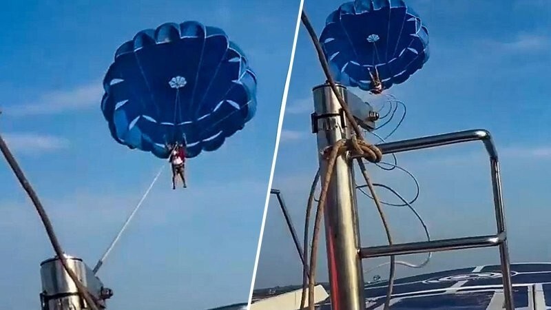 У берегов Бага‑бич в индийском Гоа турист оказался в опасной ситуации во время занятия парасейлингом: трос, удерживающий парашют и человека, внезапно порвался, и мужчина упал в море.