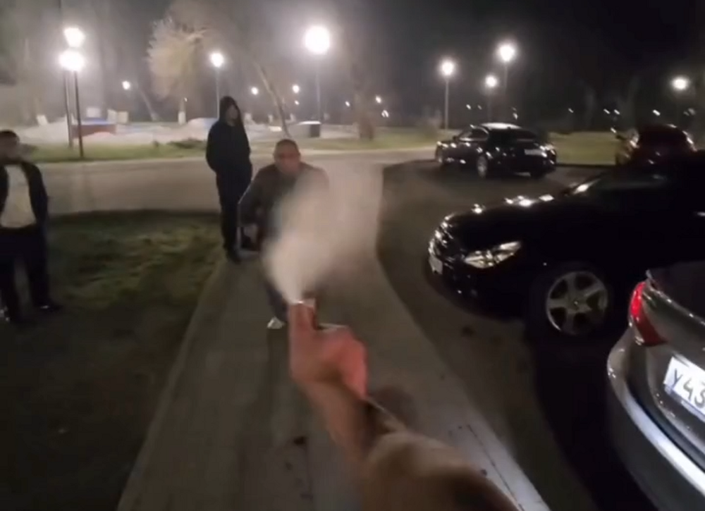 Когда мужчина попытался напасть на одного из парней, человек, который снимал происходящее, вовремя применил газовый баллончик и остановил агрессора. Пострадавших серьёзно нет, а полиция проводит проверку.