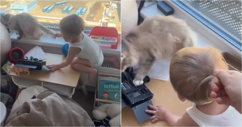Во время игры ребёнок потянул кота за хвост, и мать быстро отреагировала, потянув сына за волосы. Так она пыталась показать, что животным причинять боль нельзя, превращая обычный момент воспитания в наглядный урок.