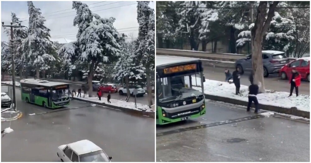 Школьники начали бросать снежки в проезжавший мимо автобус. Водитель принял вызов. Он выбежал из салона и принялся кидать снежки в ответ.