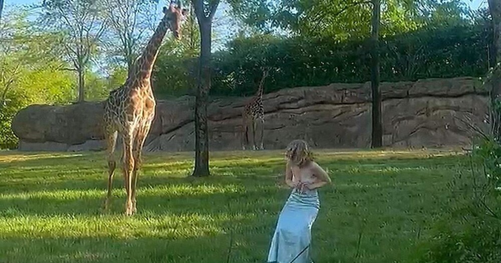 В американском зоопарке посетительница прыгнула в вольер с жирафами, нарушив правила безопасности, после чего одно из животных бросилось за ней.