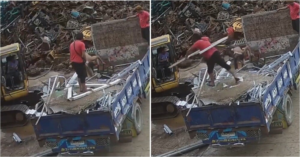 Рабочий, разгружавший грузовик на свалке металлолома, не рассчитал вес конструкции, которую перемещал, и рухнул на землю под собственным усилием.