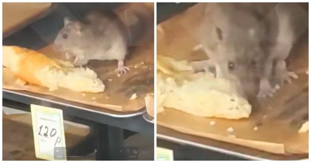 Женщина запечатлела крысу, которая ела багет в одной из точек быстрого питания в Москве. Выпечка лежала на стеллаже с прошлой рабочей смены.