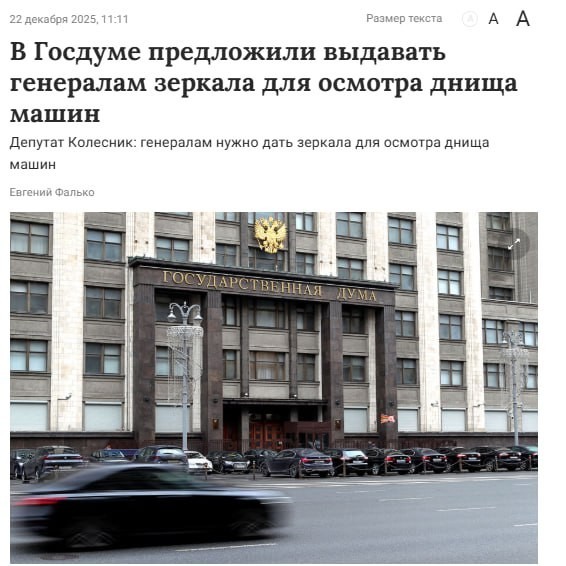 Депутат Андрей Колесник предложил выдавать всем военным маленькие зеркальца, чтобы они каждый раз перед тем, как садиться в машину, проверяли днище автомобиля. Это, на секундочку, член комитета Госдумы по обороне такие предложения выдаёт.