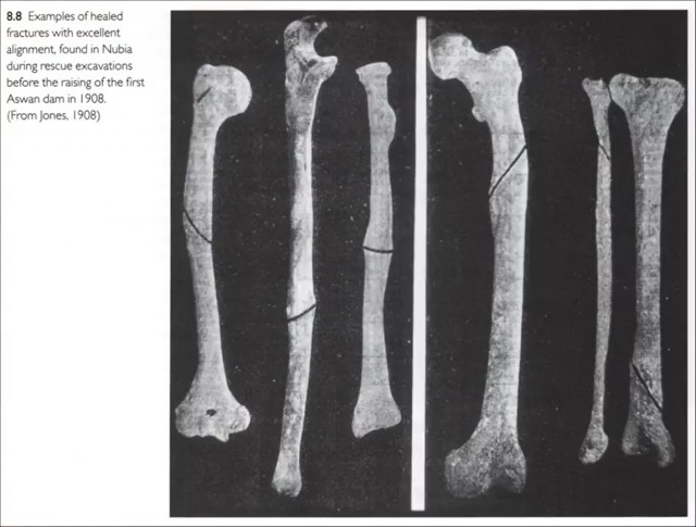 Есть примеры великолепно составленных и срощенных костей. Достаточно редко этот материал изучается египтологами, но здесь вы видите в подписи – в 1908 году, когда была сооружена первая Асуанская плотина «Британка», американский выдающийся учёный Джордж Райзнер поднял очень много тел из некрополя, просто чтобы спасти человеческие тела от наступающей воды. И дальше, ввиду того что их было очень много, было принято решение поставить на них интересные медицинские исследования и посмотреть, как жили эти люди. Это люди, которые жили с этими переломами, очень точно, ювелирно составленные кости. Понятно, что составление костей дальше уже предполагало использование деревянных брусков, которые накладывались на кость. Таким образом, срощенные кости у мумий тоже не редкость.