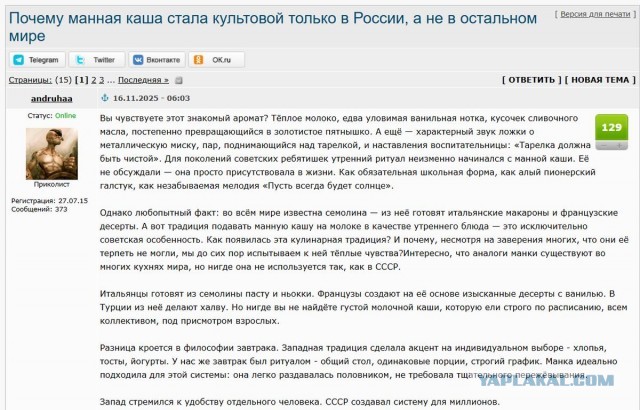 Каждый второй блогер, не считая первого, спешит рассказать, что манную кашу едят только в России и постсоветских странах. Вот прямо классический пример:
