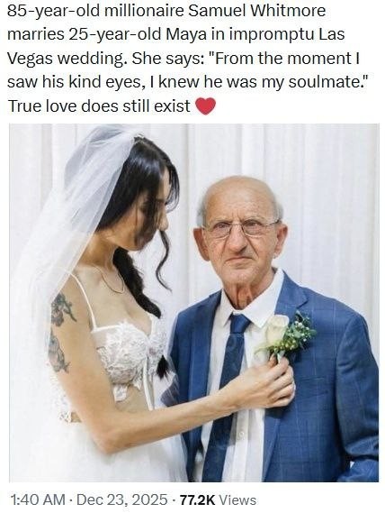 85-летний миллионер Сэмюэль Уитмор женился в Лас-Вегасе на 25-летней Майе. «В тот самый миг, когда я впервые поймала взгляд его добрых глаз, я поняла: он назначен мне судьбой!» Не слушайте тех, кто говорит, что настоящей любви не бывает, что это все выдумки. Еще как бывает.