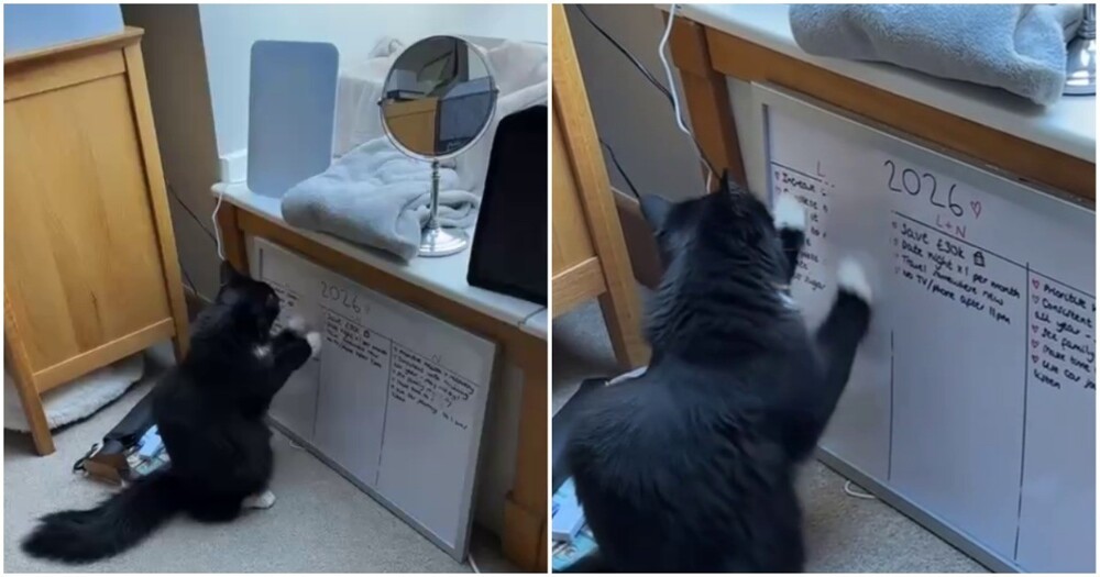 Девушка записала маркером на доске цели на 2026 год. Питомец подошел к доске и внёс правки.
