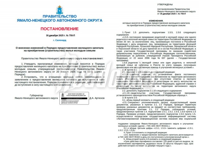 С 1 января в ЯНАО вступили в силу новые правила программы жилищного капитала для молодых семей. Теперь претендовать на поддержку смогут только граждане России, родившиеся на ее территории или прожившие в стране не менее 20 лет. Это требование не касается уроженцев вновь присоединенных регионов и участников госпрограммы по переселению соотечественников.