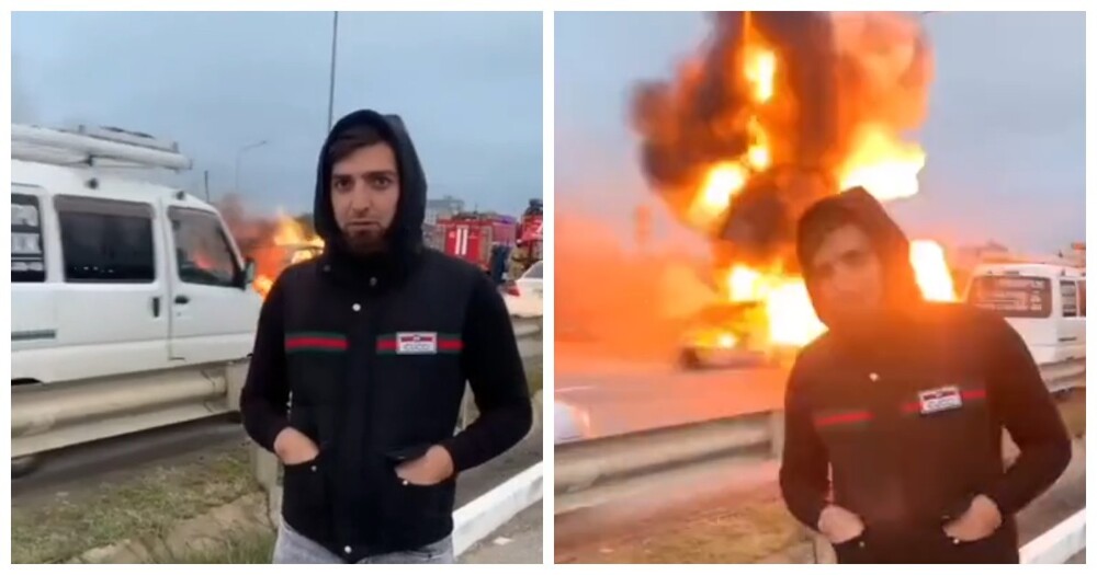 В Краснодаре после ДТП парень решил снять последствия на фоне горящей машины, но словил жёсткие тайминги и машина взорвалась прямо за его спиной. Никто не пострадал.
