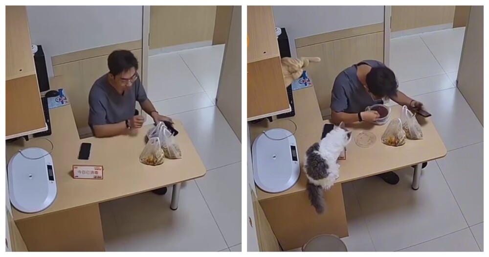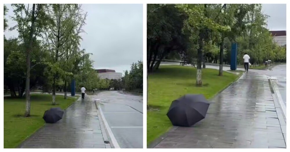 Житель Китая не захотел, чтобы черный кот промок во время ливня. Парень накрыл пушистого своим зонтом и ушёл.