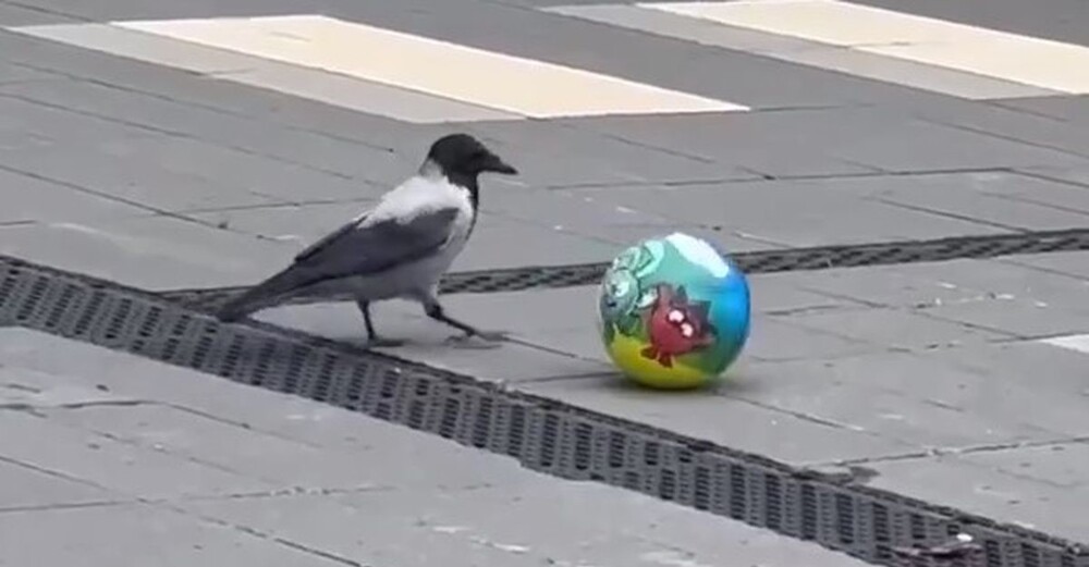 Жители Москвы стали свидетелями забавной сцены. Ворона с завидным упорством катала клювом небольшой мяч у станции метро «Динамо».