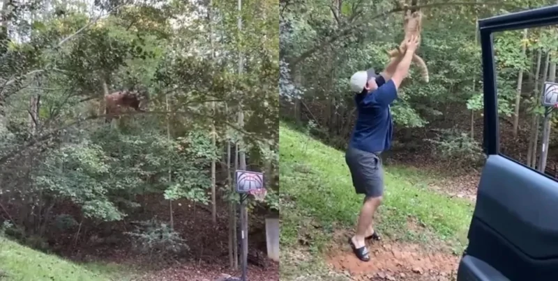 Пара из США заметила на дереве пушистого, который туда забрался и застрял на ветке. Когда мужчина решил броситься на помощь котику, стало ясно — падения с ветки несмотря на помощь не избежать.