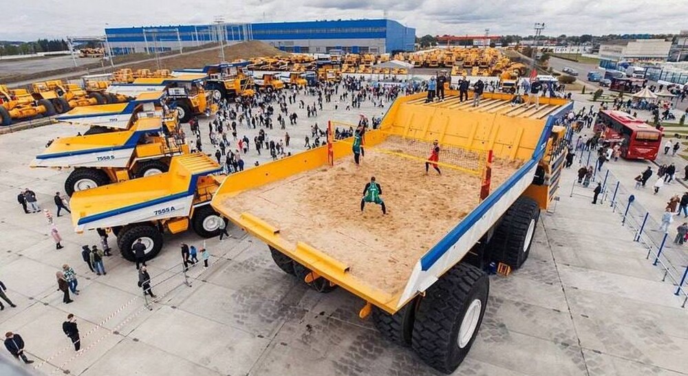 В Беларуси недавно прошёл необычный матч по пляжному волейболу. Спортсмены сыграли в кузове самого большого карьерного самосвала в мире - 450-тонного "БелАЗа-75711".