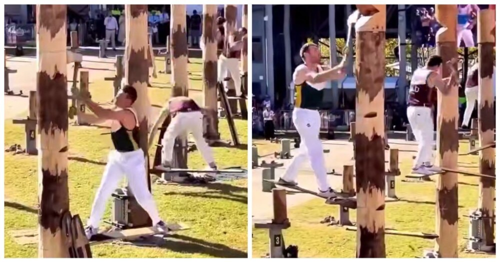 Перед вами одна из сложнейших дисциплин на турнирах дровосеков. Участники "прорубают" себе путь на вершину бревна. Побеждает тот, кто первым срубит вершину.