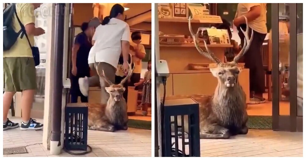 В японском городе Нара, где обитают и спокойно ходят по улицам почти 1,5 тысячи оленей, один из них улегся прямо на входе в ресторан Животное считается священным и прогонять его нельзя, поэтому посетители просто аккуратно перешагивают через оленя.