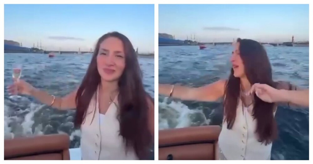 Компания девушек каталась на лодке и пела любимые песни. Одна из представительниц прекрасного пола слишком увлеклась и попала в курьезную ситуацию.
