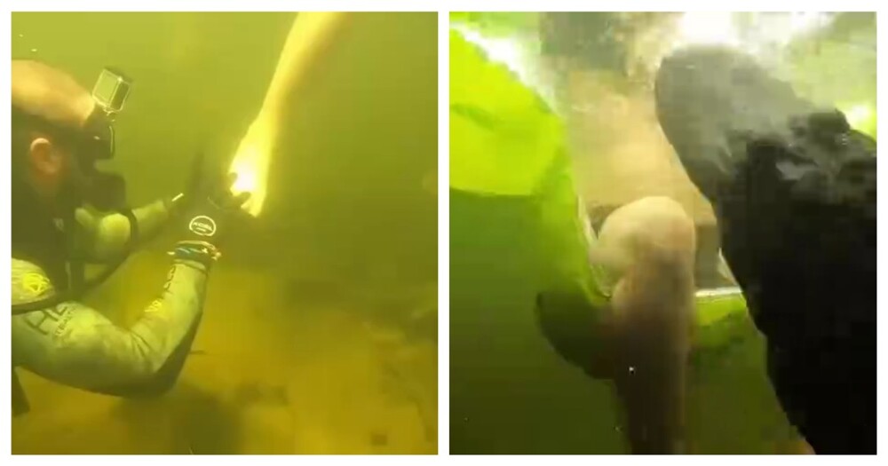 Любители подводного плавания подшутили над отдыхающими в водоеме людьми. Дайверы хватали людей за ноги и пугали фейковой головой аллигатора.