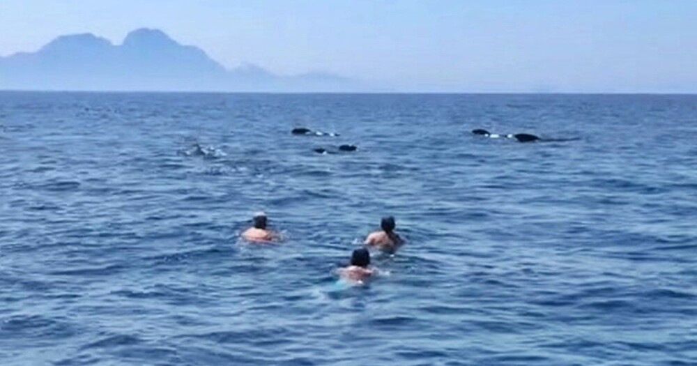 На кадрах, снятых 4 октября в Гибралтарском проливе, трое мужчин прыгают с прогулочного катера и плывут к гриндам. После публикации видео пользователи соцсетей осудили пловцов за их безрассудные действия.