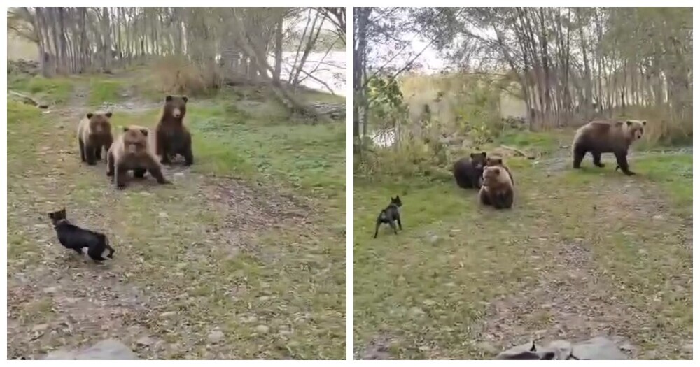 В лесу мужчина стал свидетелем неожиданной сцены: его собака подошла к медведице с медвежатами и начала их зазывать к игре. Медведица настороженно наблюдала, но не проявила агрессии.