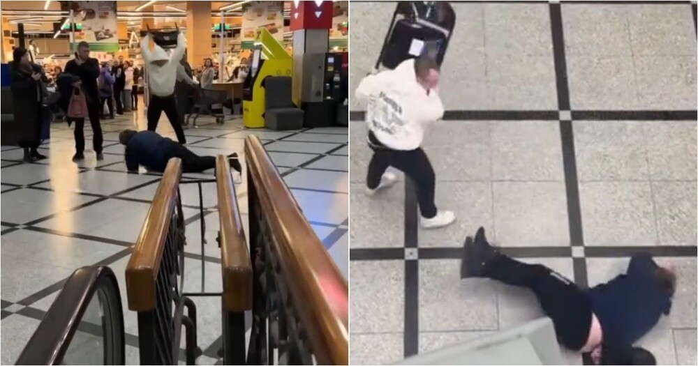 В одном из крупных торговых центров Екатеринбурга произошла драка, в ходе которой один из участников нанес удары стулом по спине лежащего человека.