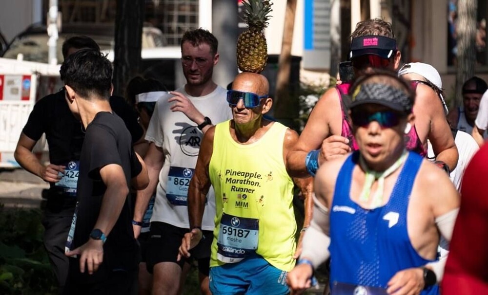Преодолеть марафонскую дистанцию само по себе непросто, а этот пожилой бегун еще сильнее усложнил себе задачу. Он бегает с ананасом на голове.
