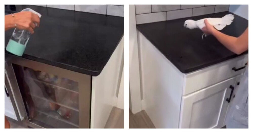Женщина опрыскала кухонный гарнитур водой из пульверизатора. Спустя несколько секунд её попугай повторил звук работы распылителя.