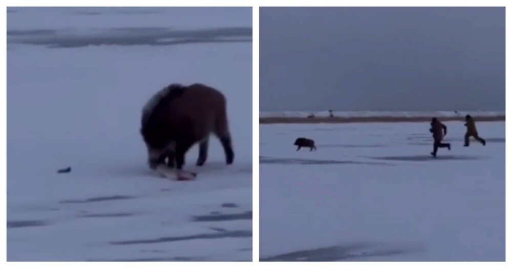 Лиса заметила рыбу у рыбака и не смогла устоять. Схватив верёвку пастью, она тащила добычу по льду, проявляя свою ловкость и хитрость.