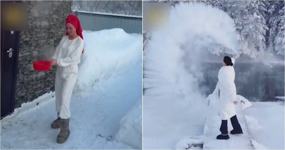 Россиянки разбрызгивают кипяток на морозе, пытаясь поймать эффект «снежной дымки», когда вода должна мгновенно испариться и кристаллизоваться в воздухе. Однако из-за недостаточно низкой температуры трюк не срабатывает: горячая вода не замерзает и брызги попадают прямо в лицо, оставляя ожоги.