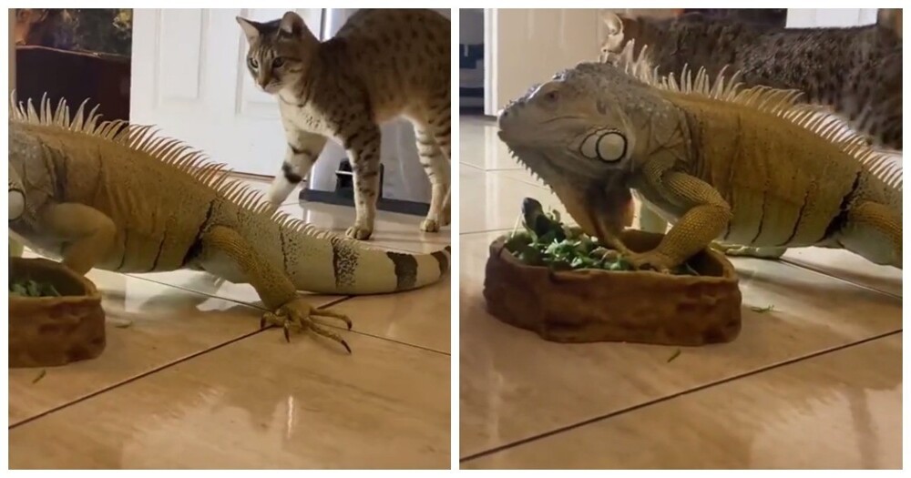 Хозяин кошек и игуаны запечатлел эпизод из жизни питомцев. Котики не понимают, что за замечательный сосед поселился в их доме.