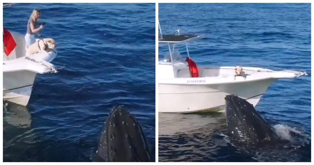 Жители США и их пёс Фин наткнулись у берегов Сан-Диего на двух горбатых китов. Их встреча попала на видео.