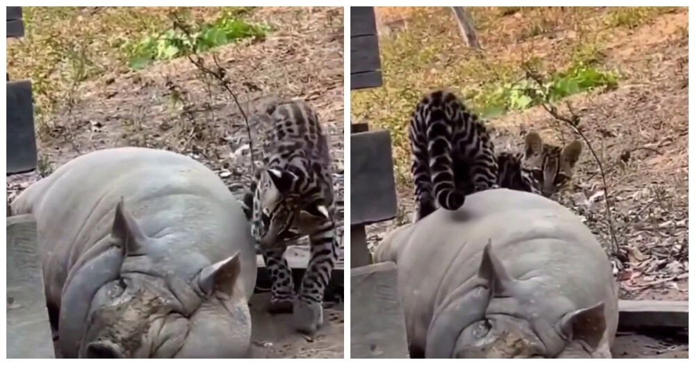 Оцелот наткнулся на свинью и решил её съесть. Свинья была настолько толстой, что практически не замечала его укусов.