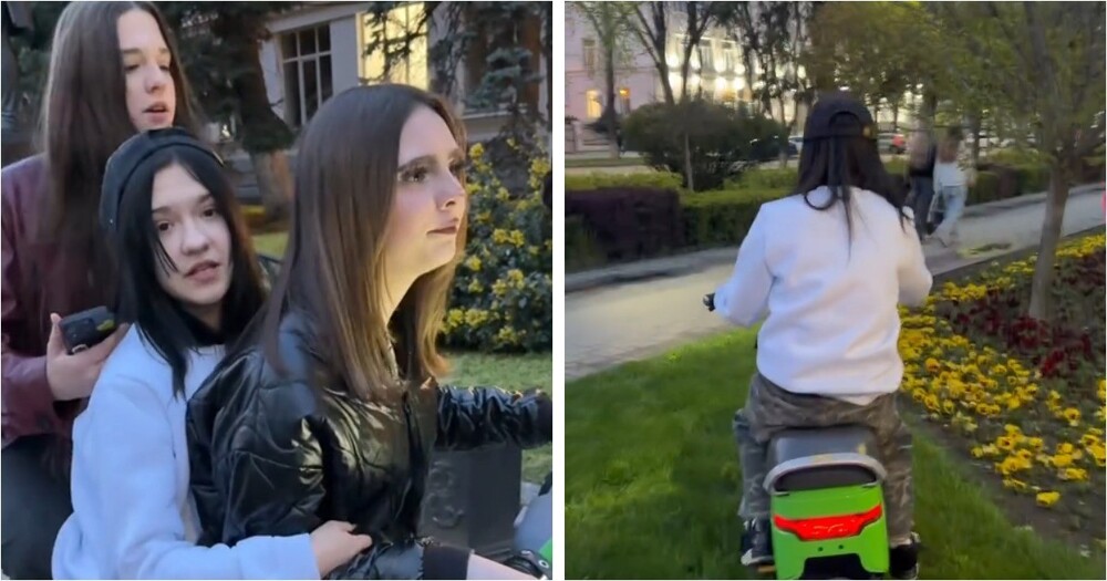 С наступлением весны девушки вышли с фуд-кортов: сели на двухколесный транспорт и покатились мимо дорожки в тюльпаны. Теперь школьницы будут оправдываться в полиции в присутствии родителей.