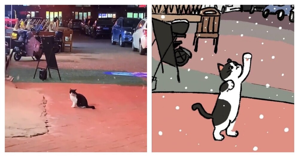 Кот впервые увидел снег и начал ловить снежинки. Наблюдать за пушистым одно удовольствие.
