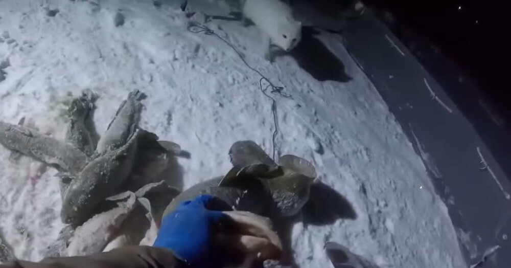 Рыбак позволил песцу забрать одну из пойманных рыб. Видео снято 11 ноября в Туруханском районе Красноярского края.