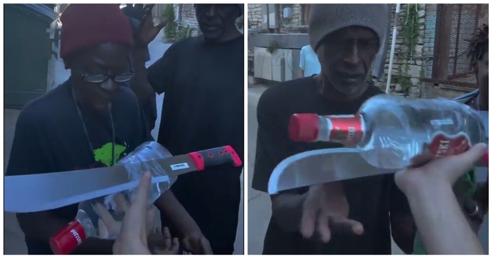 Блогер продолжает раздавать бездомным ножи, чтобы сделать улицы безопасней. В данном ролике к ножам прибавились бутылки с алкоголем.