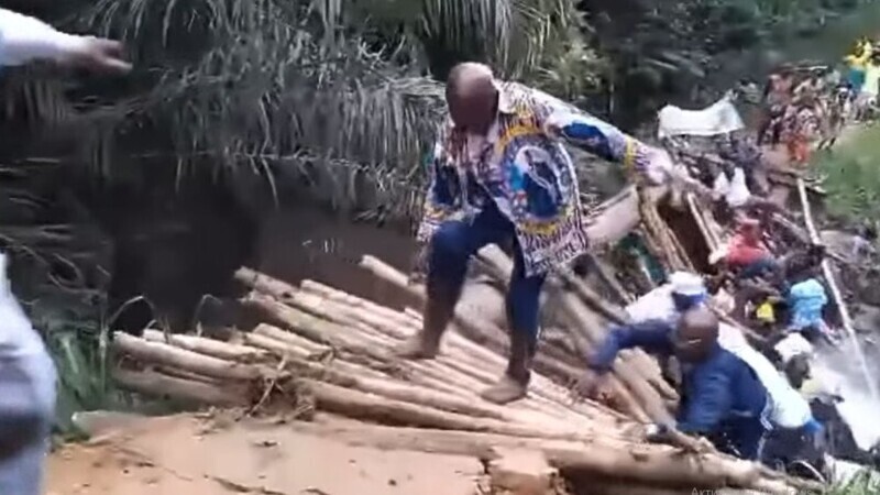 В Конго за 2 миллиона долларов построили деревянный мост, который обрушился в первый же день после открытия. Местные жители снимали церемонию открытия на камеры, однако в один момент переправа обрушилась.