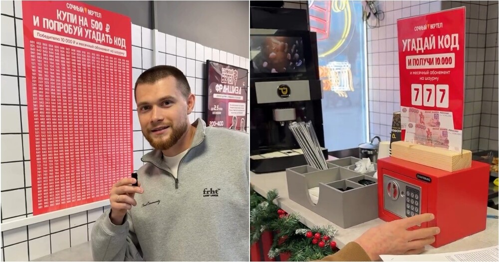 В одном из заведений общепита владелец придумал необычную акцию: клиенты получают попытку открыть сейф с 10 тысячами рублей за каждые 500 рублей в чеке. Чтобы забрать деньги, нужно угадать трёхзначный код. Не угадал — комбинация вычёркивается в таблице, чтобы другие могли её не повторять.